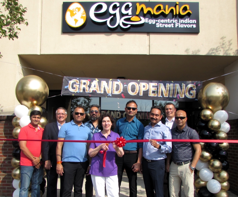 FOR RELEASE: June 26, 2025Mayor Janice S. Mironov, Council Member John Zoller and Council member Joseph Miczak joined Eggmania owners and staff for a ribbon cutting celebration marking the grand opening of their new restaurant in the Windsor Crossing shopping center at the intersection of Route 33 a