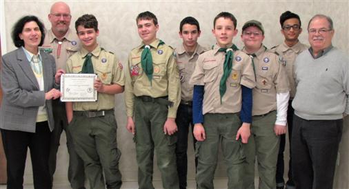 Boy Scout Troop 59. Pictured (from left to right) are: Mayor Janice S. Mironov; John O'Brien, Group Leader; Dayne Wolfe; Aidan Sharpe; Zach Hupfl; Brendan Reiss; NicholasSeminerio ; Chirayu Gupta, and Gary Fournier, Clean Communities Committee Vice Chairperson. -
