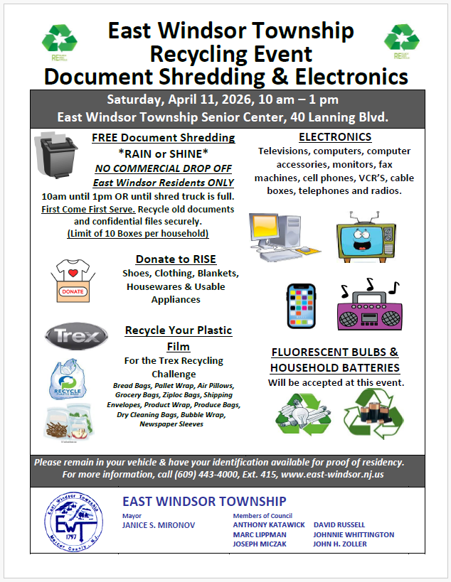 Mayor Janice S. Mironov announced that East Windsor Township is holding a Township Document Shredding and Recycling Event on Saturday, April 11, 2026 from 10 a.m. to 1 p.m., rain or shine, at the East Windsor Township Senior Center (40 Lanning Boulevard).