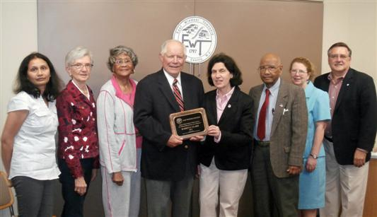 East Windsor Township Mayor Janice S. Mironov presents Barry Clark with the 2014 “Sylvia Weiss Senior Citizen Award for Outstanding Service as a Volunteer”. Pictured (from left to right) are: Commission on Aging Auxiliary Member Nandita Jupudi; Commission on Aging Member Sydelle Norris; Commission on Aging Chairperson Ondina Jeffers; Barry Clark; Mayor Janice S. Mironov; Commission on Aging Member Hash Shah; Commission on Aging Auxiliary Member Susan Flaster, and Council Member John Zoller, Liaison to the Commission on Aging.