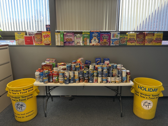 East Windsor Township Delivers Food Donated by the Community to Local Food Pantry. Mayor Janice S. Mironov and Council Members sponsored the New Year's Food Drive, asking area residents and businesses to donate non-perishable food items through the month of January at the Municipal Building, Police/Court Building, and East Windsor Volunteer Fire Company 2. The food drive benefitted the food pantry of RISE, an area-based organization that provides assistance to local individuals and families.  -