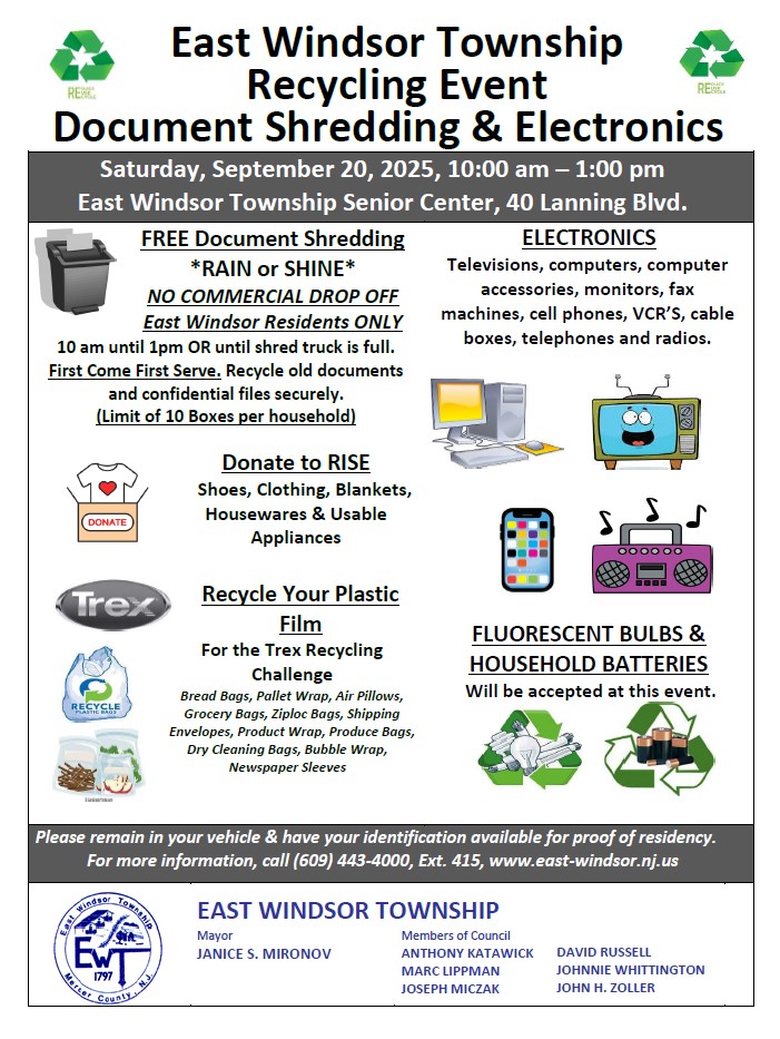 Mayor Janice S. Mironov and Council Members joined Chief Executive Officer Swami Iyer and Aurobindo executives for a ribbon cutting of the new 170,100 square foot facility on Windsor Center Drive. Pictured (from left to right) are: Srikanth Bommareddy, Senior Director/Technical Operations; Sanat Chattopadhyay, Executive Vice President and President of Merck Manufacturing Division; Mangalam Ramasubramanian Kumar, Independent Director and Non-Executive Chairman; Vishal Harsh, Deputy Consul General of India in New York; Mayor Janice s. Mironov; Mercer County Executive Daniel Benson; Swami Iyer, Chief Executive Officer, Aurobindo Pharma USA; P. V. Ram Prasad Reddy, Executive Chairman; Council Member Joseph Miczak; and Nitin Chhabra, Aurobindo Project Engineer.  Mayor Janice S. Mironov and Council Members joined Aurobindo Chief Executive Officer Swami Iyer and other Aurobindo executives and special guests to celebrate the opening of the new 170,000 square foot building on their East Windsor campus. - REMINDER: Mayor Janice S. Mironov and Council Members Sponsor Recycling Day Event Saturday, September 20 from 10 A.M. to 1 P.M., Rain or Shine, at the East Windsor Senior Center (40 Lanning Boulevard). Free paper shredding services to securely dispose of unneeded personal documents and confidential files will be available, until the shredding truck is full, to East Windsor Residents Only. No commercial documents, there is a limit of ten boxes per household. Plastic film recycling is available as part of the "Trex Recycling Challenge".Trex sponsors an annual challenge program rewarding groups who collect more than 500 pounds of plastics within six months with a free bench. Plastic materials accepted include bread bags, grocery bags, air pillows, ziploc, bubble wrap, produce bags, dry cleaning bags, shipping envelopes and newspaper sleeves. Electronic recycling is available for computers, computer monitors, laptops and televisions. Also accepted for drop-off are fluorescent bulbs, cell phones and printer cartridges. No other electrical items will be accepted. RISE will be on site to collect usable furniture, clothing, blankets and working household appliances and electronics. For further information, call (609) 443-4000, ext. 415.