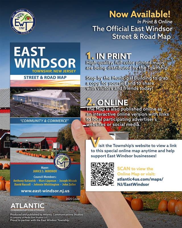- East Windsor Township and the Township Economic Development Committee Announce Updated “TOWNSHIP OF EAST WINDSOR, NJ STREET & ROAD MAP.” The map includes every street in the Township, with an index for locating streets. The newly produced Township map also features places of interest in the Township such as parks and open space, shopping centers, corporate/business centers, preserved farmland, schools, police and fire, and other sites of interest. The full map and brochure, as seen in the printed version, is viewable on the Township website (CLICK HERE) or via the QR code on the face of the below graphic. Limited numbers of the printed version of the map are available at the municipal building (16 Lanning Boulevard). The map, produced and printed by Atlantic Communications Group in partnership with the Township, is underwritten by local businesses and advertisers.